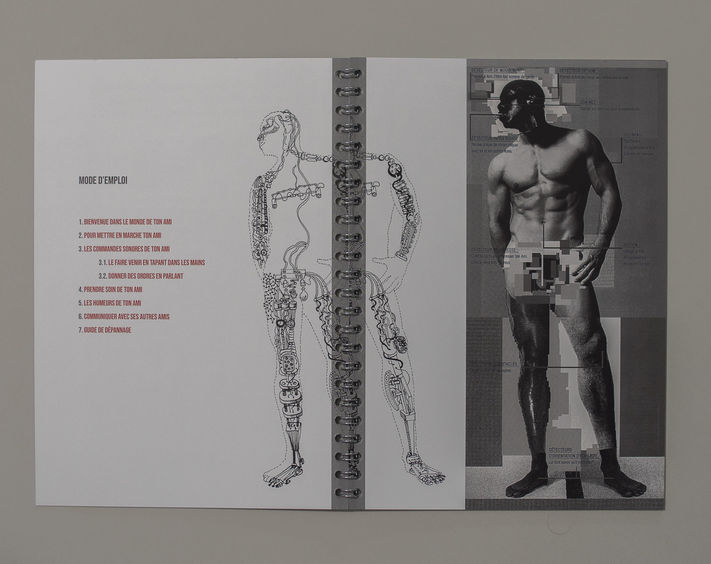 AMI est inspiré du mode d’emploi d’un chien robot appliqué à l’humain sur le mode du Tamagotchi. De 2003 à 2005, avant même Facebook, de nouveaux amis ont pu être créés grâce à des dons d’images de parties de leur corps faits par des participants lors de certaines de mes performances visant à nous mettre en garde contre la tendance à traiter l’humain comme un objet à mesure que s’accroît notre sentiment de dépendance à l’égard de la machine. Une première génération de robots domestiques étaient des machines-outils conçues pour nous assister dans nos tâches quotidiennes et nous faciliter la vie. La deuxième génération de machines intelligentes, apparue sous la forme de gadgets, de jouets et de substituts de nos animaux de compagnie, adoptant volontiers des allures humanoïdes ou animaloïdes (chiens-robots, etc.), exige désormais en retour que l’on s’occupe d’elles, au point de développer chez l’humain un sentiment de culpabilité si nous les délaissons. Devenue prolongement nerveux et prosthétique de notre être social qui régule et détermine une large part de nos relations sociales, la machine peut générer chez l’humain un sentiment d’isolement et d’exclusion sociale, mais aussi de dépendance d’impuissance à son égard.
